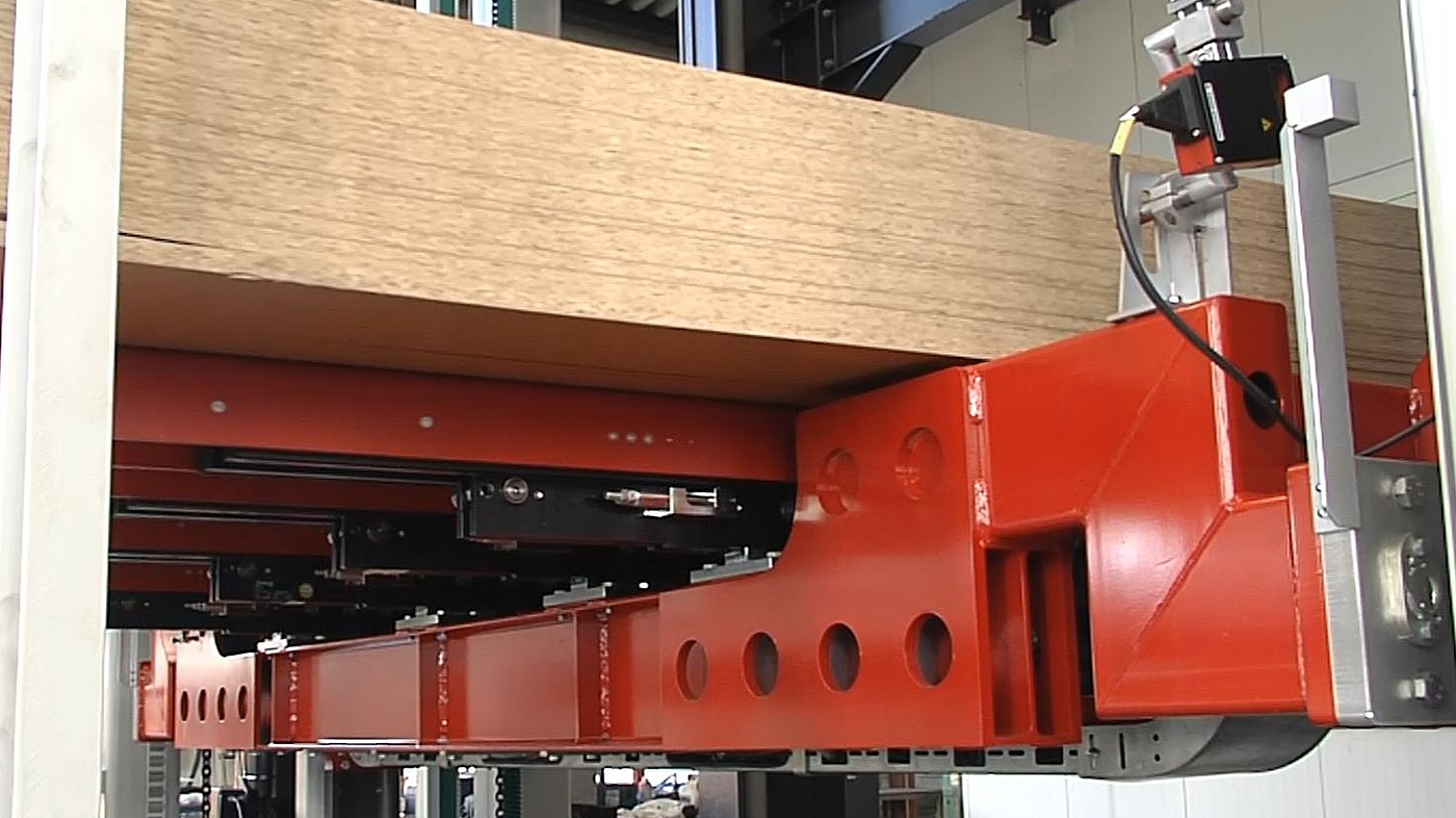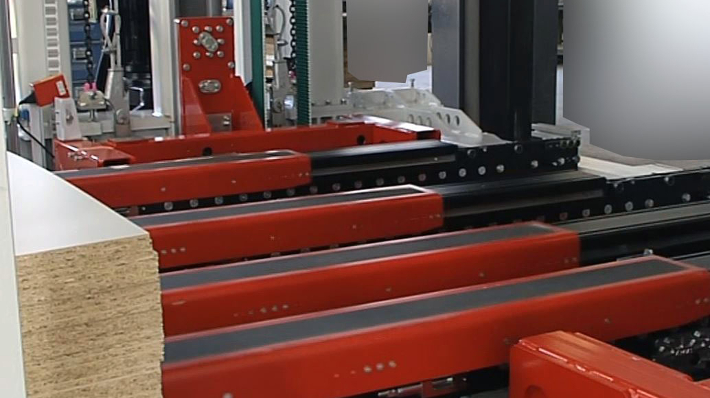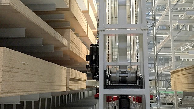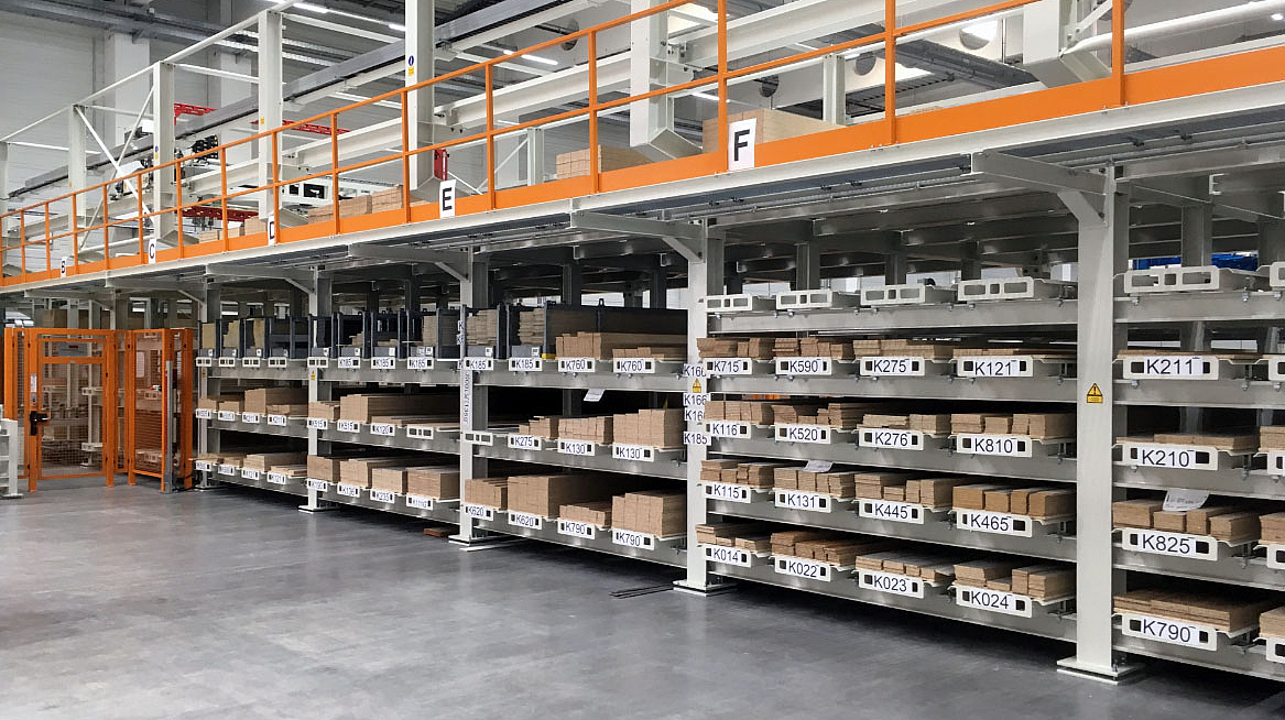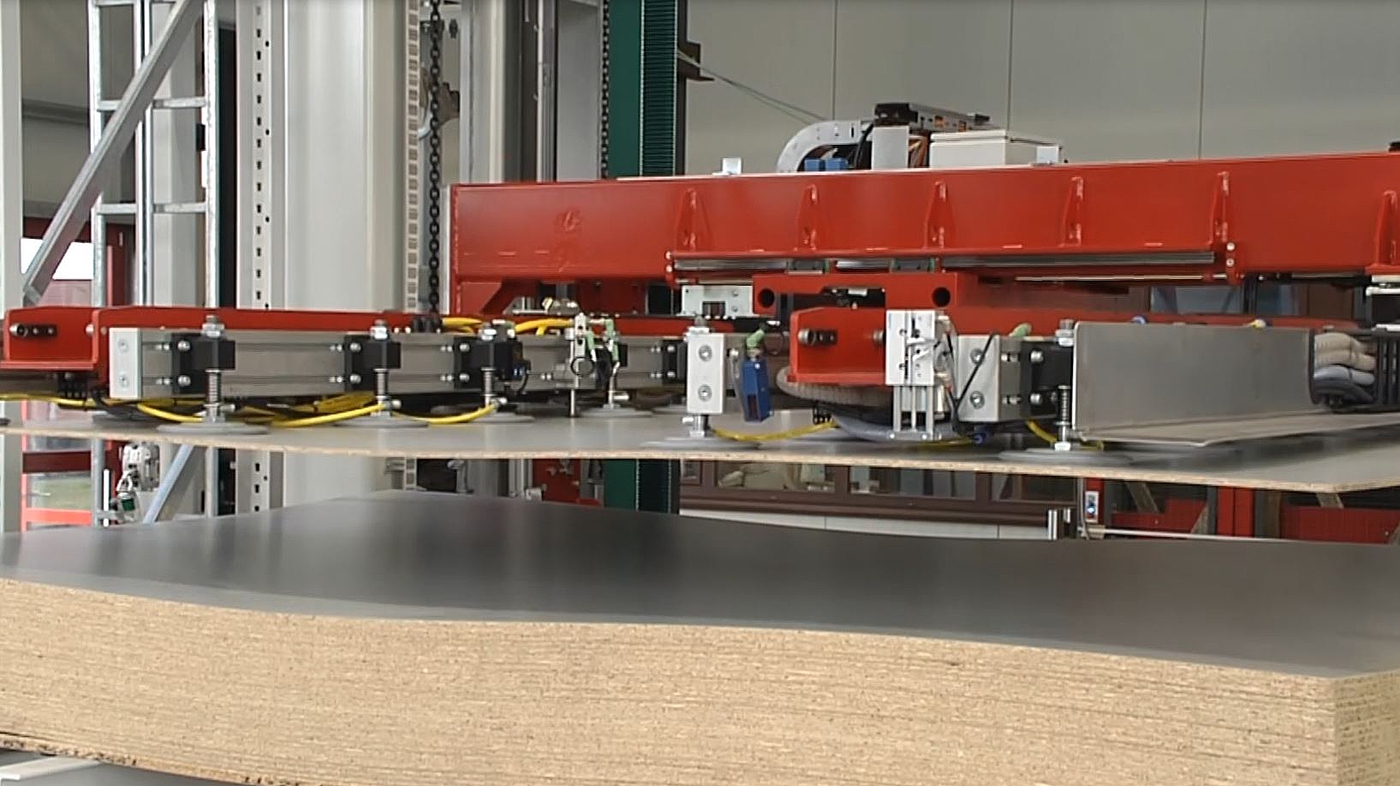 Orders are pre-picked and stacked. For this purpose, the suction beam takes a protective plate and assembles a stack in reverse production order on the trailing stacking beam. This production stack is then placed on the conveyor system provided for this purpose at the time of the request and forwarded to the subsequent process.Protective plates to be returned and/or plate remnants are picked up again by the stacker crane and stored in the space allocated to them.