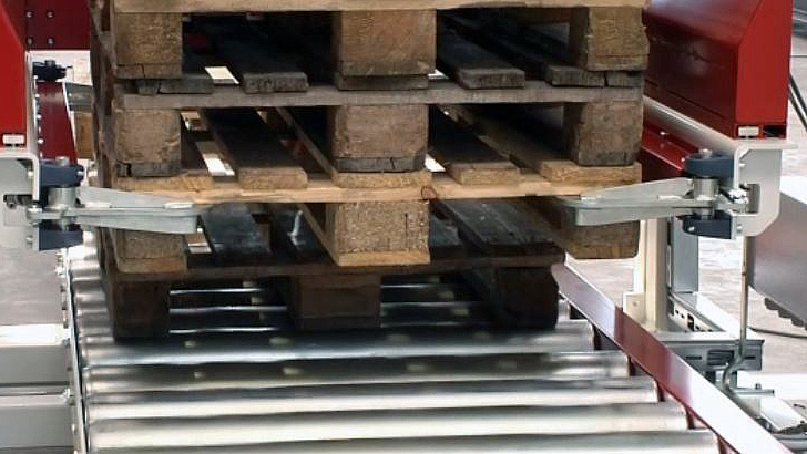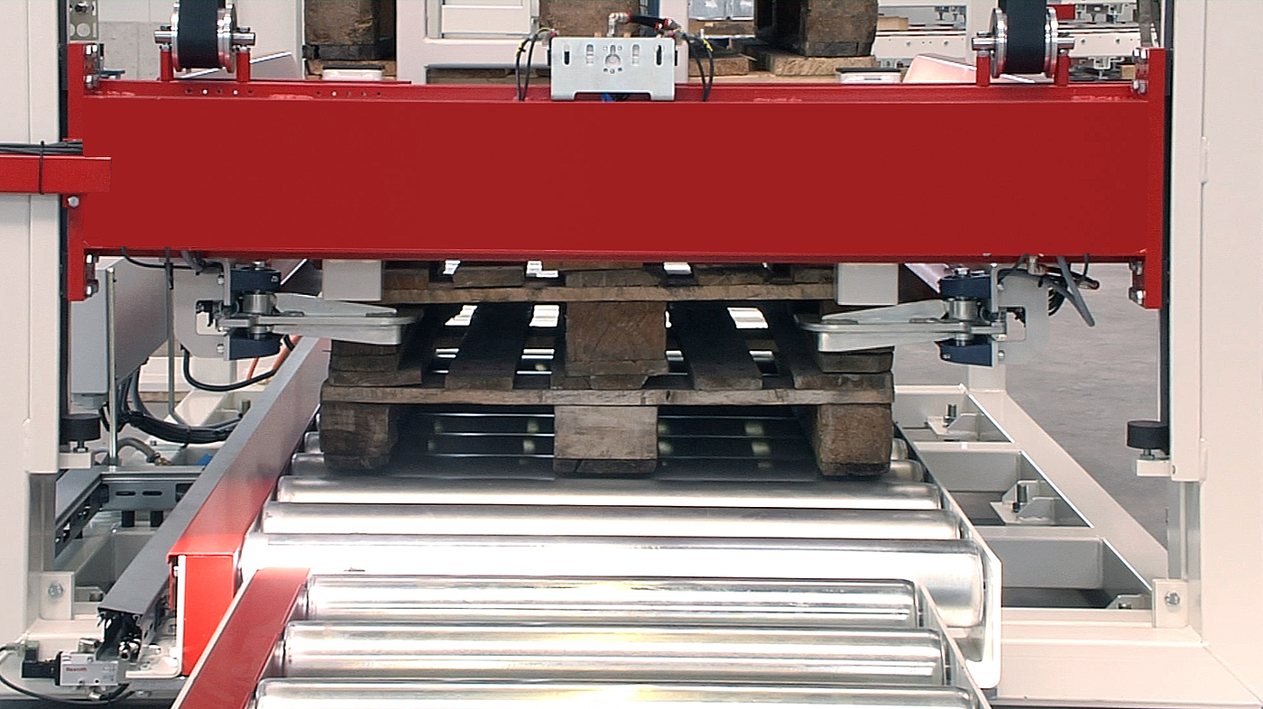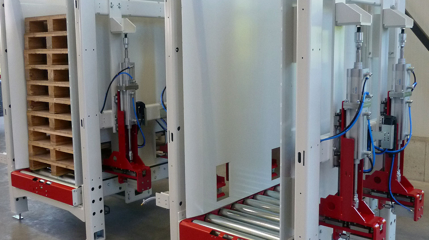 Due to the automatic width adjustment and motorized lift, the magazine can hold different dimensions of single origin or deliver them to different production lines. Production processes for internal pallet systems or disposable pallets may be automated by only one magazine. The collection of empty EURO pallets is easily realised within a high-bay warehouse through transport by so-called T-Cars.