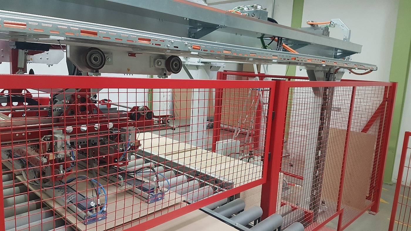 In addition to the automatic feeding of the plate stacks via a customer-side cross-conveyor carriage into the infeed, the plates are picked up from the lifting tables in the infeed by a portal system with suction frame. Individually, they are fed to the overhauled laminating line via inclined roller conveyors. In addition to the various panel materials, material thicknesses from 3 to 40 mm can also be run.