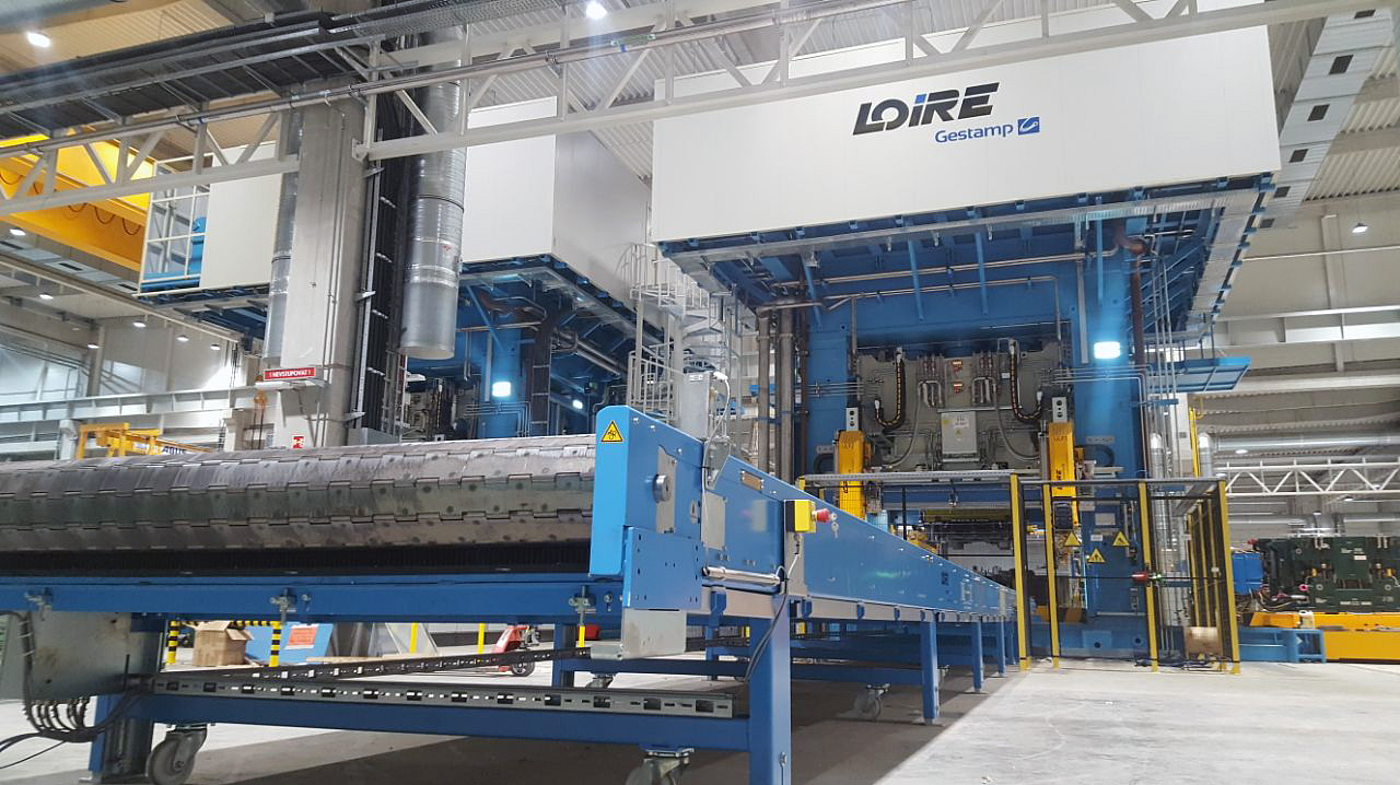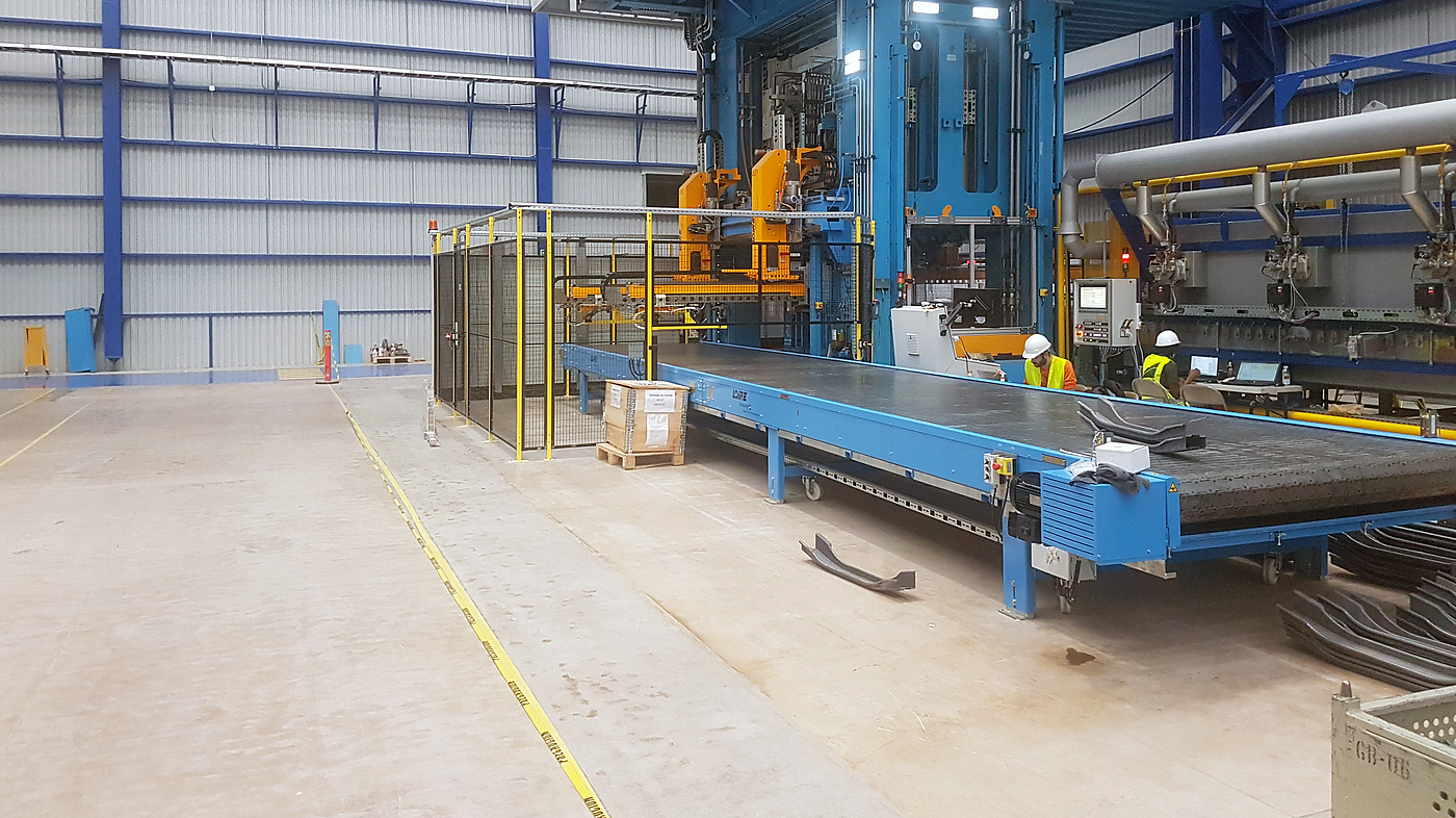 The End of Line area of a hot forming line has one or more outfeed conveyors. For this purpose, HORSTKEMPER has developed modular, abrasion resistant discharge conveyors with hinged belts that withstand residual heat of the components within a range of up to approx. 200°C. These conveyors are available in lengths between 8 and 28 metres and widths between 1.2 to 2.3 metres. Solid construction and a design of the outfeed conveyor suitable for a press plant ensures high availability in a demanding environment.