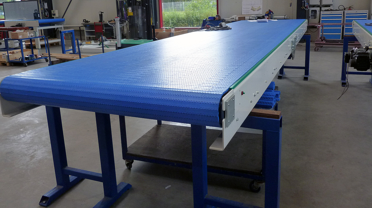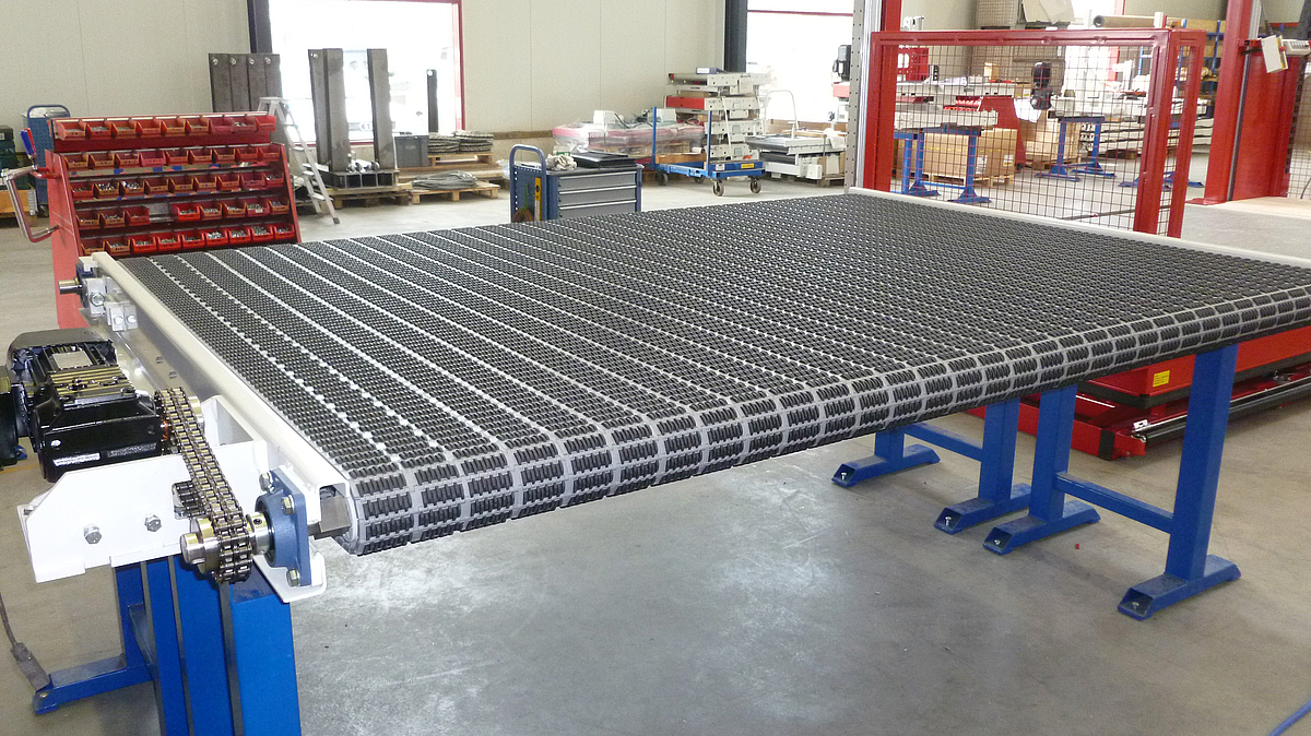 Wir statten z. B. Montagelinien, Verpackungslinien, Versandlinien und mehr mit speziellen Kunststoffgliederbändern aus. Diese sind begehbar und so konzipiert, dass keine elektrostatische Aufladung erfolgt. Durch spezielle Kugelbänder kann man die Richtung des Fördergutes in verschiedene Bahnen lenken: drehen, versetzen oder als Richtungsänderung.