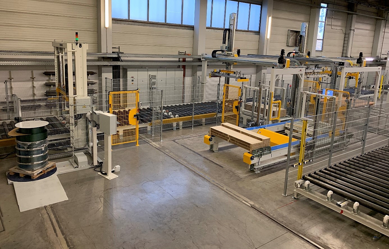 Die Verpackungsanlage übernimmt dabei voll automatisiert die Plattenstapel von der bestehenden Fördertechnik und führt diese unter einer Nadelrollenstation durch, um die oberste Platte zu markieren, damit diese als Schonerplatte zu erkennen ist.