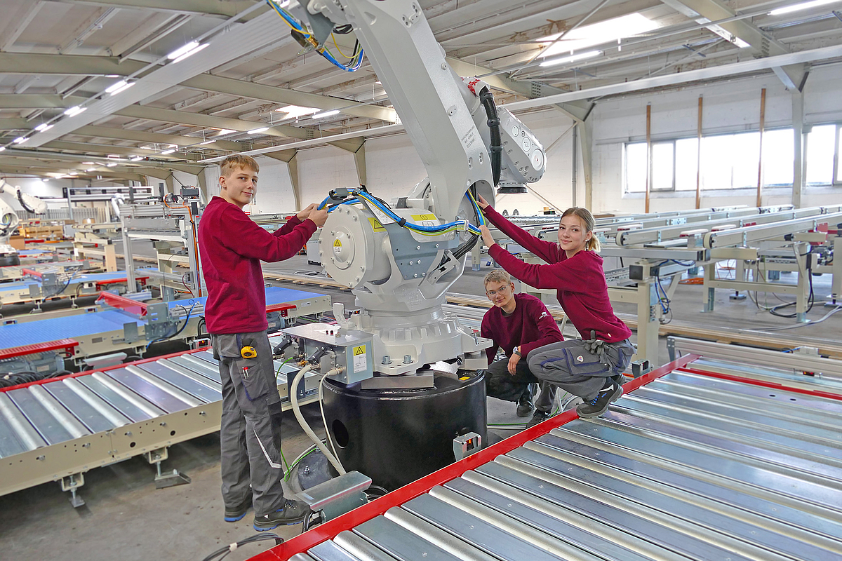 Spannende Aufgaben im Maschinenbau, inklusive Robotikanwendungen, gilt es ab nun zu entdecken und zu erlernen. Erste Berührungspunkte mit der Automation im Maschinenbau hatten bereits Felix Vertkersting, Michael Röhr und Marleen Seyda (v.l.)
